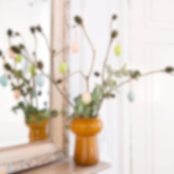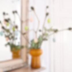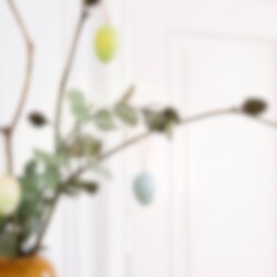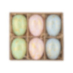 Disse elegante påskeæg i bløde pastelfarver med smukke gulddetaljer giver din påskedekoration et luksuriøst touch. Fremstillet af plast for ekstra holdbarhed, passer de perfekt til at hænge i påskeris eller bruge i andre kreative dekorationer. Størrelse cirka 6 x 4 cm.