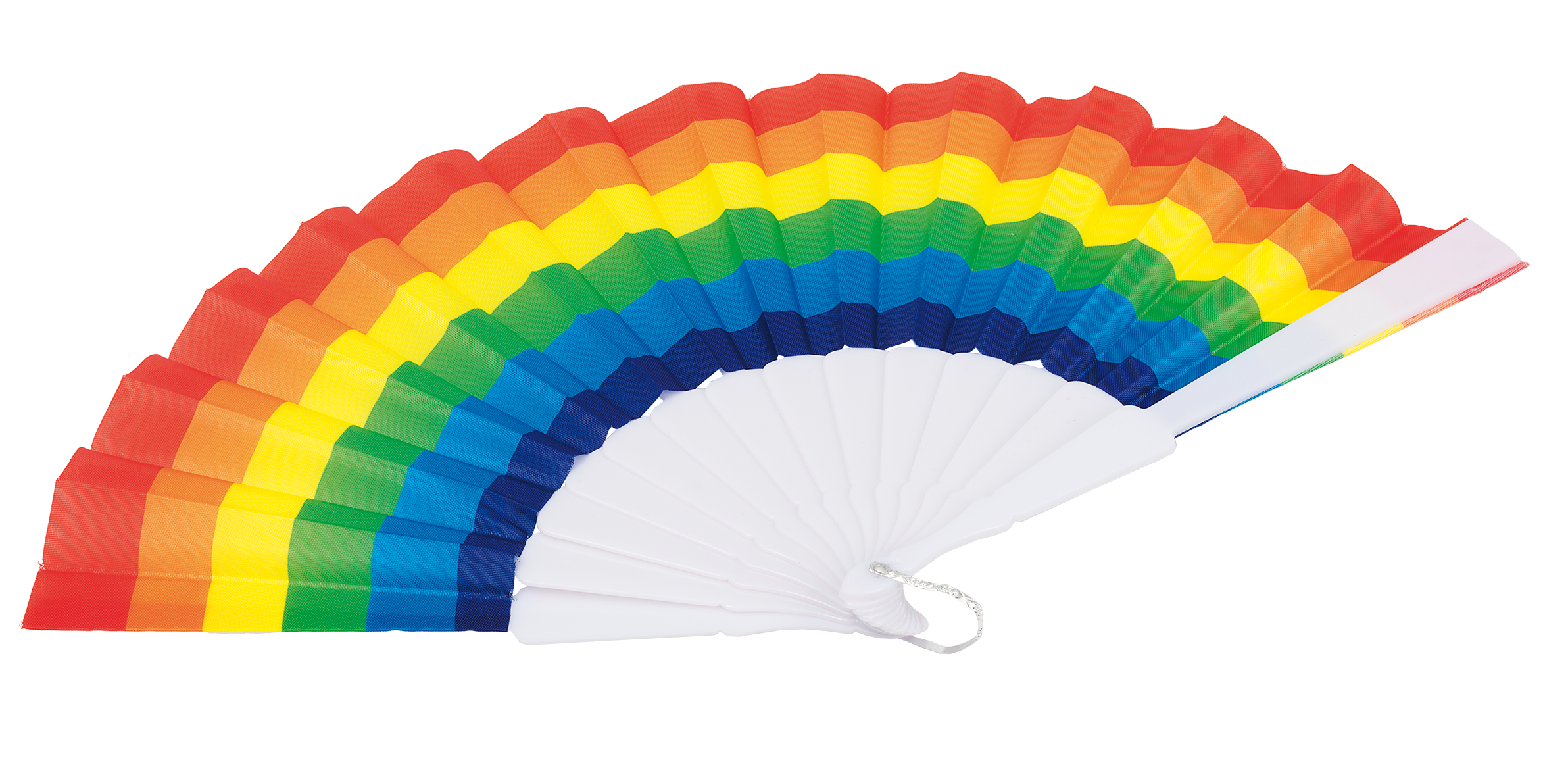 Stillfull regnbågsfärgad solfjäder som du kan ha när till Priden. Solfjädern är ca 23 cm stor.