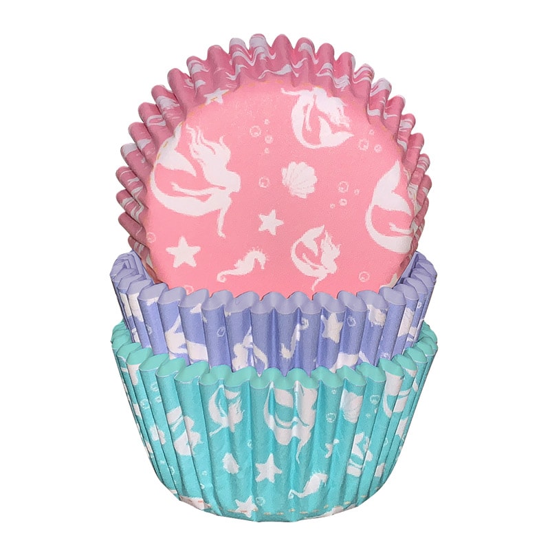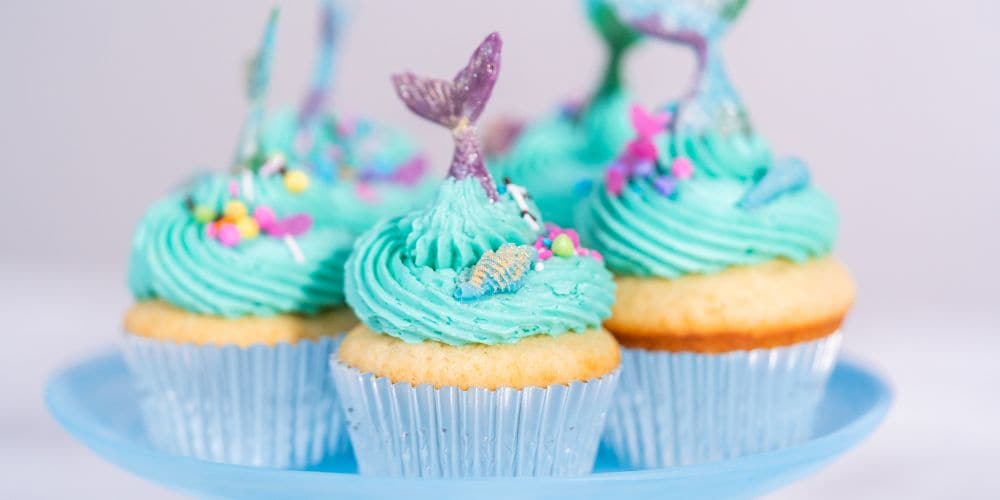 Havfrue Cupcakes = Cupcakes med blå/turkis frosting, dekoreret med drys, chokolademuslinger og havfruefinner
