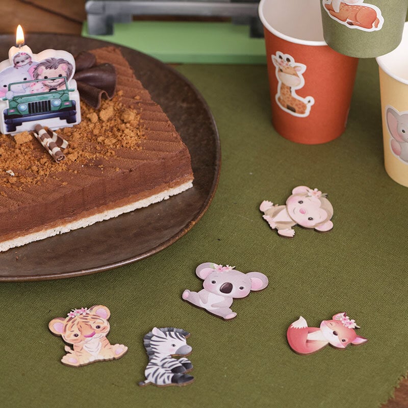 - Dekorer bordet med konfetti som matcher til temae. Vi foreslår konfetti med palmeblade og aber fra Let's go wild-kollektionen eller luksuriøs trækonfetti fra Baby Safari-kollektionen.