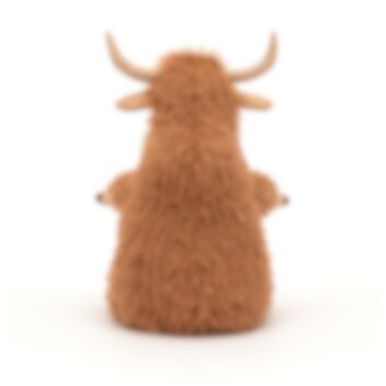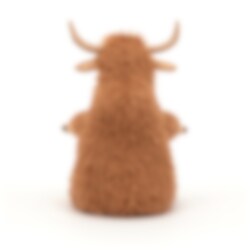 En temmelig tyk og dejligt fluffy skotsk højlands ko, der sidder og hviler efter at have leget rundt på de grønne enge. Med sin tykke rødbrune pels, et glad smil på det tofarvede ansigt, chokoladebrune hover og fine buede horn i mocka-efterligning, er denne darling en kærlig ven at elske. Håndvaskes efter behov.