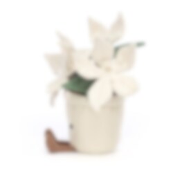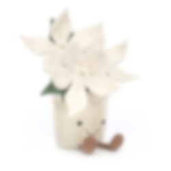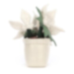 En sjov og elegant dekoration eller blødt tøjdyr i form af 3 hvide julestjerner med gulddetaljer, plantet i en kawaii-inspireret glitterkrukke med et glad smil og små ben. Denne bløde og nuttede stueplante kan bruges som en smuk dekoration til jul eller på skrivebordet, en der ikke skal vandes og tåler at blive væltet af for eksempel kataloger, dyr eller børn. Ellers kan julestjernen simpelthen bruges som et anderledes blødt stykke legetøj med lækre detaljer. Fremstillet af 90% polyester, 10% bomuld og kan håndvaskes og hænges tørt efter behov.