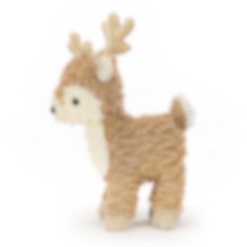 Et sødt rensdyr i lysebrunt og hvidt, med fløjlsbløde horn og hove og en sød lille chokoladebrun næse. Dette lidt pjuskede lille rensdyr har en sød lille hale, imponerende horn og er både smuk og nuttet. Benene er bløde, men stærke nok til, at rensdyrene kan rejse sig og være en del af pynten denne vinter eller i julen. Fremstillet af 78% polyester, 17% bomuld, 4% rayon, 1% spandex og håndvask efter behov.