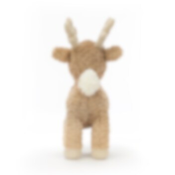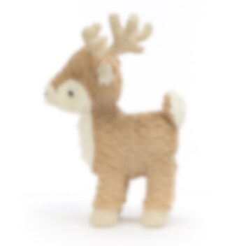 Et sødt stående rensdyr med nuttet pels i lysebrun med hvide aftegninger og fløjlsbløde horn og hove. Dette krammelige rensdyr har imponerende horn, formede hove, en sød lille hale og en sød lille chokoladebrun næse, samt robuste, men bløde ben at stå på. Rensdyret kan også blive en fin dekoration om vinteren eller julen.