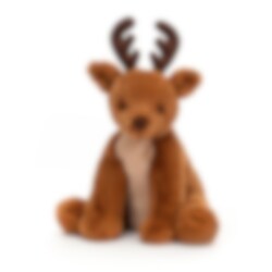 Et kælent blødt rensdyr i karamelbrun pels med beige mave og glatte chokoladebrune horn. Denne krammekammerat har bløde spidse ører, en glat chokoladebrun næse, et sødt udtryk og en vidunderlig kælen krop. En perfekt ledsager til hyggelige aftener derhjemme og legende eventyr. Fremstillet af 100% polyester og håndvasket evt.