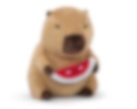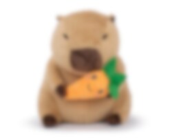 Denne søde capybara-bamse holder en lille gulerod i favnen, hvilket gør den ekstra charmerende og nem at holde af. Med sit rolige udtryk og sin bløde form bliver den en sød figur for alle, der kan lide capybaraer og hyggelige bamser med personlighed.