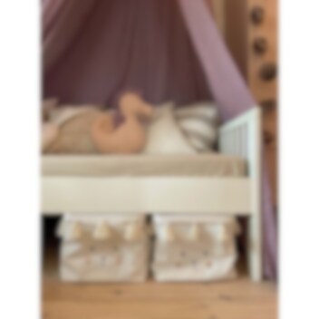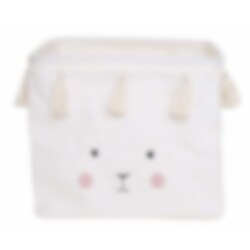 Pæn og praktisk opbevaringskurv i tekstil med et motiv af et kaninansigt på ydersiden. Perfekt til at holde børneværelset ryddeligt efter hver legesession. Opbevaringskurven har et voksbehandlet indre, hvilket betyder, at den bevarer sin form, selv når den ikke er fyldt.