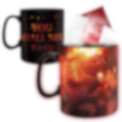 Porcelænskrus, der skifter udseende, når varme drikke hældes i, med et utroligt smukt motiv af Gandalf, der kæmper mod Balrog i Moria fra Ringenes Herre: Eventyret om Ringen. Kruset er ca. 11 cm højt og rummer ca. 460 ml. Bør kun vaskes i hånden.