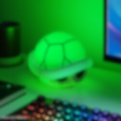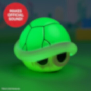 Fed lampe, der forestiller en grøn skal, fra spillet Mario Kart, fra Super Mario Bros-franchisen. Lampen er ca 12 cm høj og kører på 2 stk. AAA batterier, der ikke medfølger. Tryk på lampen for at høre de ikoniske skallyde.