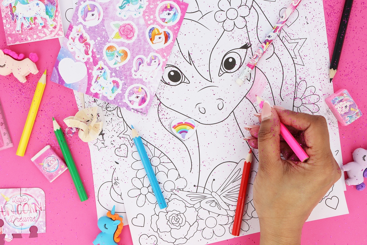 Et komplet og sjovt malesæt med enhjørningetema, som holder børnene beskæftiget i lang tid. Perfekt som aktivitet til børnefødselsdagen eller som en fin fødselsdagsgave til den lille enhjørning-entusiast. Her er alt, hvad der skal bruges for at begynde at farvelægge med det samme, med fine enhjørninger, regnbuer og diamanter.