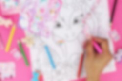 Indhold: 8 tegninger (A4), 6 små farveblyanter og 1 ark med klistermærker.