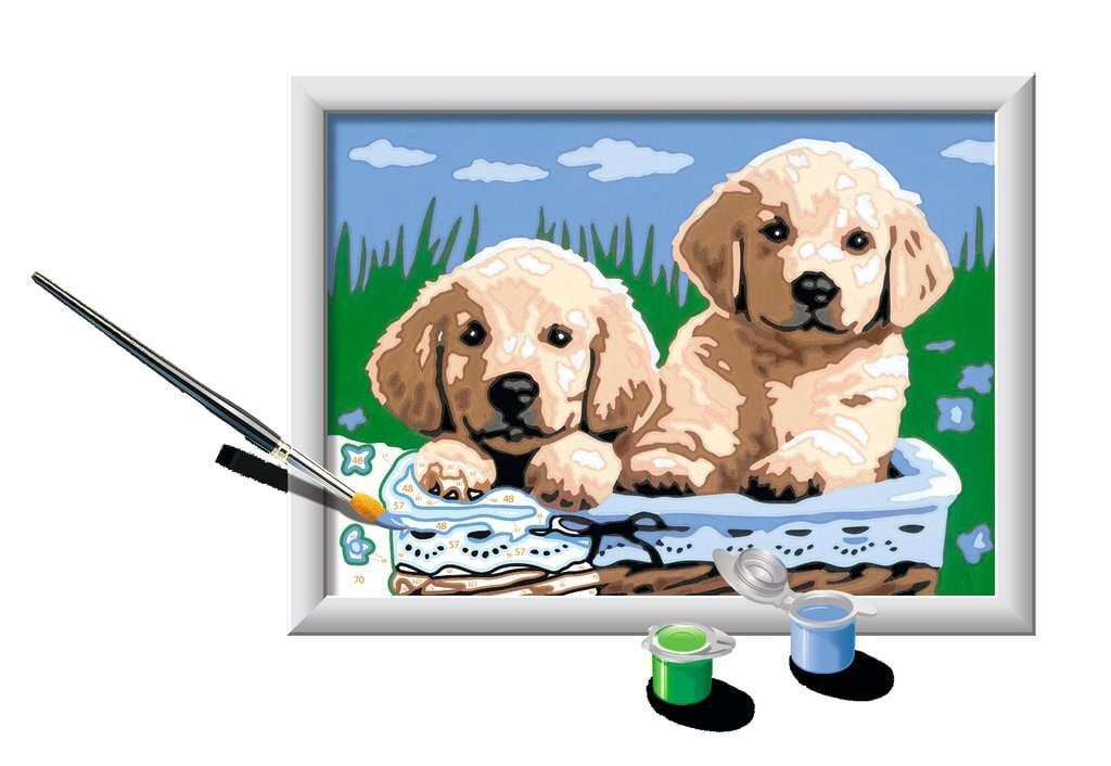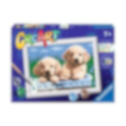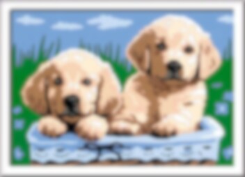 Malesæt med motiver af et par søde Golden Retriever-hvalpe, der passer perfekt til den unge håbefulde kunstner. En kreativ hobby for dem, der elsker at male og følge tal. Dette sæt er til dem, der er fra 7 år. Tavlen er ca 13 x 18 cm stor når den er færdig.