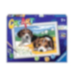 Malersæt med motiver af et par søde Jack Russell-hvalpe, der passer perfekt til den unge håbefulde kunstner. En kreativ hobby for dem, der elsker at male og følge tal. Dette sæt er til dem, der er fra 7 år. Tavlen er ca 18 x 24 cm stor når den er færdig.