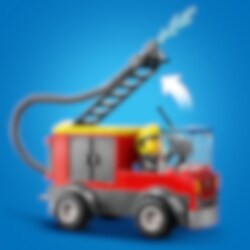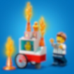 LEGO® City brandfolkene tager en velfortjent lur på brandstationen, da alarmen pludselig lyder. Hjælp – popcornsælgerens vogn står i flammer! Tjek oversigtsskærmen for at finde ud af, hvor vognen er. Grib din brandhjelm, og tag rutsjebanen ned til brandbilen... JUHUU! Hop så ombord og kør ud til brandstedet for at redde dagen... og popcornene!