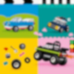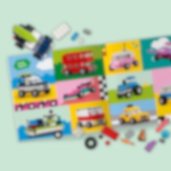 Spænd selen, og sæt fart på den sjove oplevelse med den sejeste samling af tilpasningsvenlige LEGO® køretøjer! Skab en politibil, isbil, ATV, frontlæsser, lastbil, limousine, offroader og en stationcar. Brug farverige klodser, specialelementer og mere end 50 hjul til at give dit køretøj et helt personligt look. Få 10 idéer til at gøre dine biler endnu mere fantastiske!