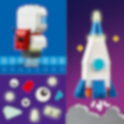 Drag ud i rummet med 5 nemme byggemodeller: et smilende solsystem, en rumraket, et sjovt rumvæsen, en fantastisk astronaut og Saturn med sine berømte ringe. Giv dine modeller et boost med flotte farver og selvlysende klodser. Før du kommer tilbage til Jorden, så tjek 10 nye idéer til de mest galak-tastiske kreationer i universet!