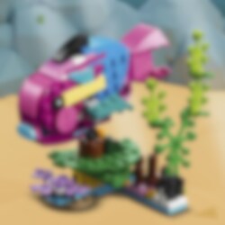 Tag en tur i regnskoven og oplev sjove eventyr med 3 eksotiske dyr! Du kan bygge en smuk Eksotisk pink papegøje, der sidder på en gren omgivet af farverige blomster. Bagefter kan du ombygge den til en flot lyserød og blå fisk, der svømmer i havet, eller en farverig frø, der kan bevæge benene. De detaljerede og bevægelige modeller i dette 3-i-1-legesæt garanterer timevis af sjov.