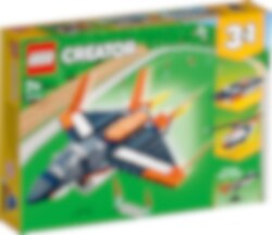 Børn fra 7 år kan nyde spændende og actionfyldt leg højt til vejrs eller på vandet med det fantastiske LEGO® Creator 3-i-1-byggelegetøj Supersonisk jet (31126). Sættet indeholder et superhurtigt jetfly med cockpit, hjul, der kan trækkes ud, flammer ud af motoren og en stand til udstilling. LEGO legetøj til fantasifuld leg LEGO fans, der elsker tempofyldt action, får 3 forskellige autentiske modeller at bygge og lege med i dette LEGO Creator 3-i-1-sæt. De kan bygge et jetfly, ombygge det til en helikopter eller en speedbåd eller bruge de 215 klodser til at skabe deres eget seje fartøj. En digital oplevelse for LEGO byggere Legesættet omfatter interaktiv digital byggevejledning, der gør byggeoplevelsen endnu sjovere. Zoom- og drejeværktøjerne i appen LEGO Byggevejledninger til smartphones og tablets hjælper børn med at visualisere modellen, mens de bygger.