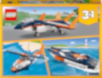 Oplev fantastiske eventyr højt til vejrs eller på vandet! Sæt dig bag styretøjet på en utrolig Supersonisk jet, og udfør vilde tricks på himlen. Tilbage på jorden kan du ombygge jetflyet til en helikopter med drejelige rotorer og flyve af sted igen, eller du kan forvandle den til en speedbåd for at opleve actionfyldt sjov på vandet. Mulighederne er uendelige med dette 3-i-1-sæt.