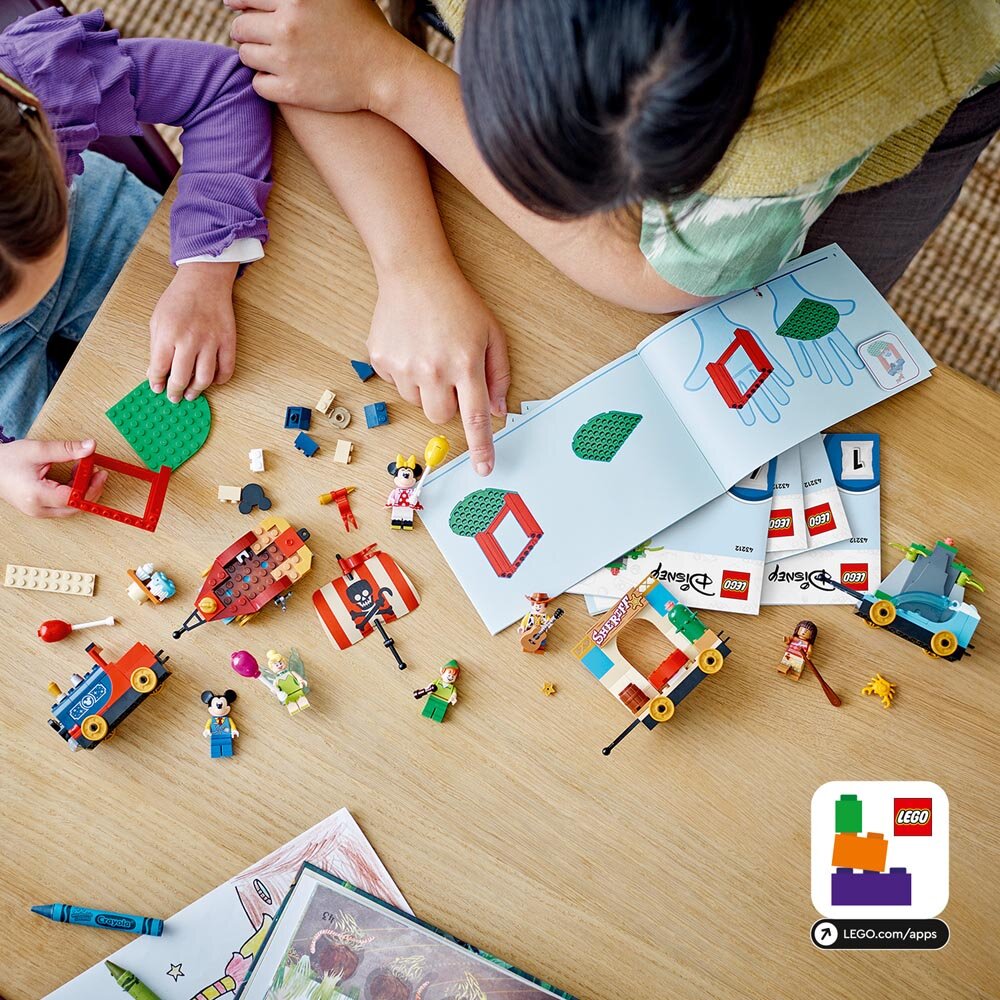 Fortryl små togfans fra 4 år med et legetøj, som alle vil tale om. LEGO® ǀ Disney sættet Disney-festtog (43212) omfatter en station, lokomotiv, 3 togvogne og 6 LEGO minifigurer: Mickey Mouse, Minnie Mouse, Vaiana, Peter Pan, Klokkeblomst og Woody. Du og dine børn kan nyde et intuitivt byggeeventyr med LEGO Builder appen, som indeholder zoom- og drejeværktøjer, så børn kan visualisere modellen, mens de bygger. Skab, brug fantasien, styrk kompetencer Dette 4+-sæt booster børns selvtillid med en sjov legeoplevelse, og startklodserne giver børn en robust base for deres model. Hver pose indeholder en figur, så børn kan starte legen hvor som helst og gøre sættet færdigt senere. Sjov for hele familien 4+-sæt er en fantastisk måde for voksne at dele sjov med børn på. Hvis den voksne heller ikke er vant til LEGO byggelegetøj, er det intet problem – børn kan tage kontrollen, fordi sættet også omfatter billedvejledning, der gør det nemt at følge processen, selv om man ikke helt kan læse endnu.