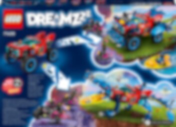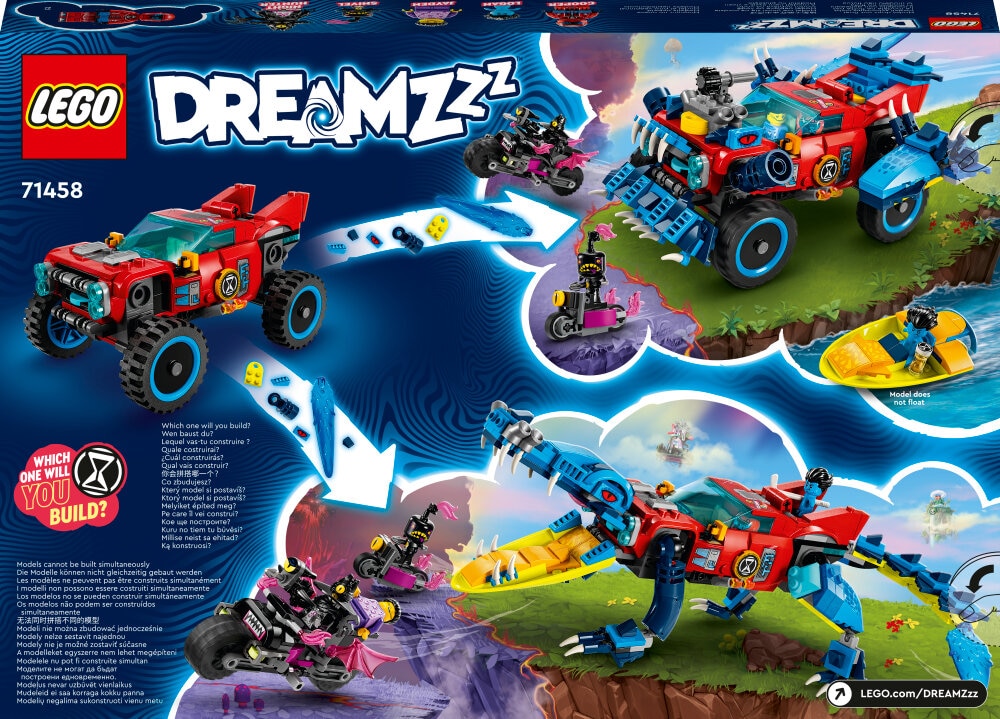 Børn fra 8 år kan drøne ind i drømmeverdenen med LEGO® DREAMZzz byggelegetøjet Krokodillebil (71458). Sættet er baseret på tv-serien, og børn kan skabe en fantastisk bil, der kan hjælpe med at redde Jayden fra den skræmmende Nattejæger! 1 sæt, 2 byggemuligheder Legesættet rummer 2 byggemuligheder og masser af historiebaserede vejledninger, der inspirerer børn til at vælge deres eget eventyr og få dobbelt så meget legetid. De kan beslutte at bygge en krokodillebil for at bekæmpe mareridtene eller en superhurtig offroader og minibåd for at jagte dem. I krokodilletilstand har køretøjet bevægelige arme og ben og en diskosskyder skjult i kølergitteret, så børn kan affyre diskosser fra krokodillens mund. I biltilstand har køretøjet rullende hjul og aftageligt tag, så en minifigur kan sidde indeni. Fantastiske minifigurer Byggelegetøjet indeholder detaljerede minifigurer af Cooper og Jayden samt Nattejægeren, der har en cool legetøjsmotorcykel og en ond hjælper.