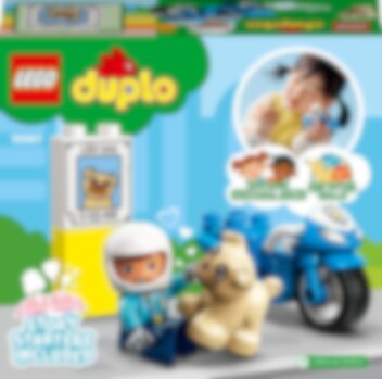 LEGO® DUPLO® redningssættet Politimotorcykel (10967) rummer fysisk og udviklende leg, der vil glæde alle små børn fra 2 år, der interesserer sig for politiarbejde, seje motorcykler og omsorg for dyr. En politiredning med uendelige legemuligheder En sød hund er blevet væk! Kan din lille helt hjælpe politibetjenten med at finde det forsvundne kæledyr? Børn kan sætte en efterlysningsplakat op og fuldføre en spændende redningsmission. Hvor gemmer hunden sig denne gang? Dette alsidige legesæt omfatter et sødt dyr, som børn kan passe, og en rar politimand på en skubbe-motorcykel og styrker dermed små børns sociale og følelsesmæssige færdigheder samt finmotorik, når de udspiller en hverdagshelts eventyr i den virkelige verden. Legende læring for små børn Forældre kan være med til at dele vigtige udviklingsmæssige milepæle, når LEGO DUPLO legetøj giver små børn ubegrænset sjov, selvudfoldelse og glad udforskning mellem hænderne.