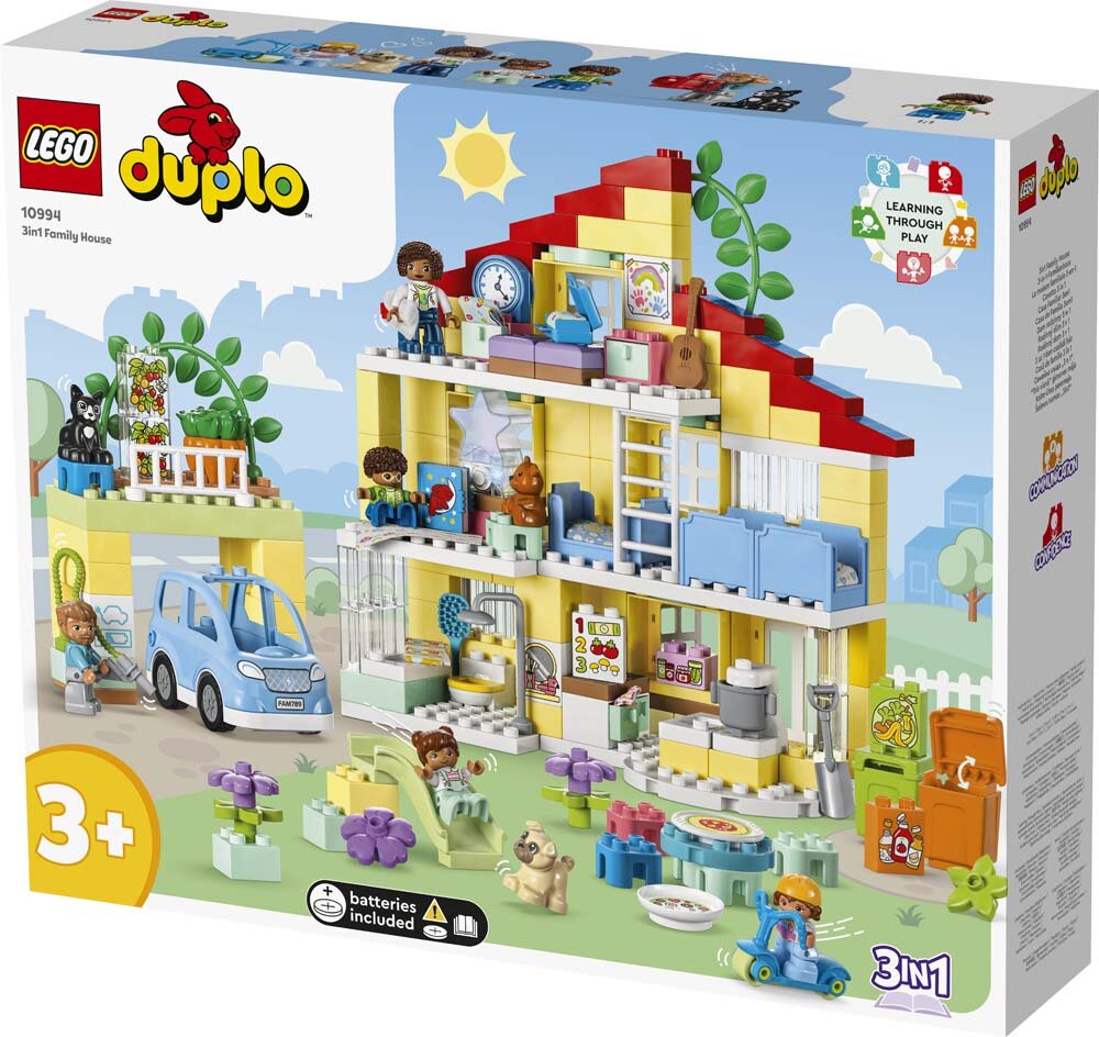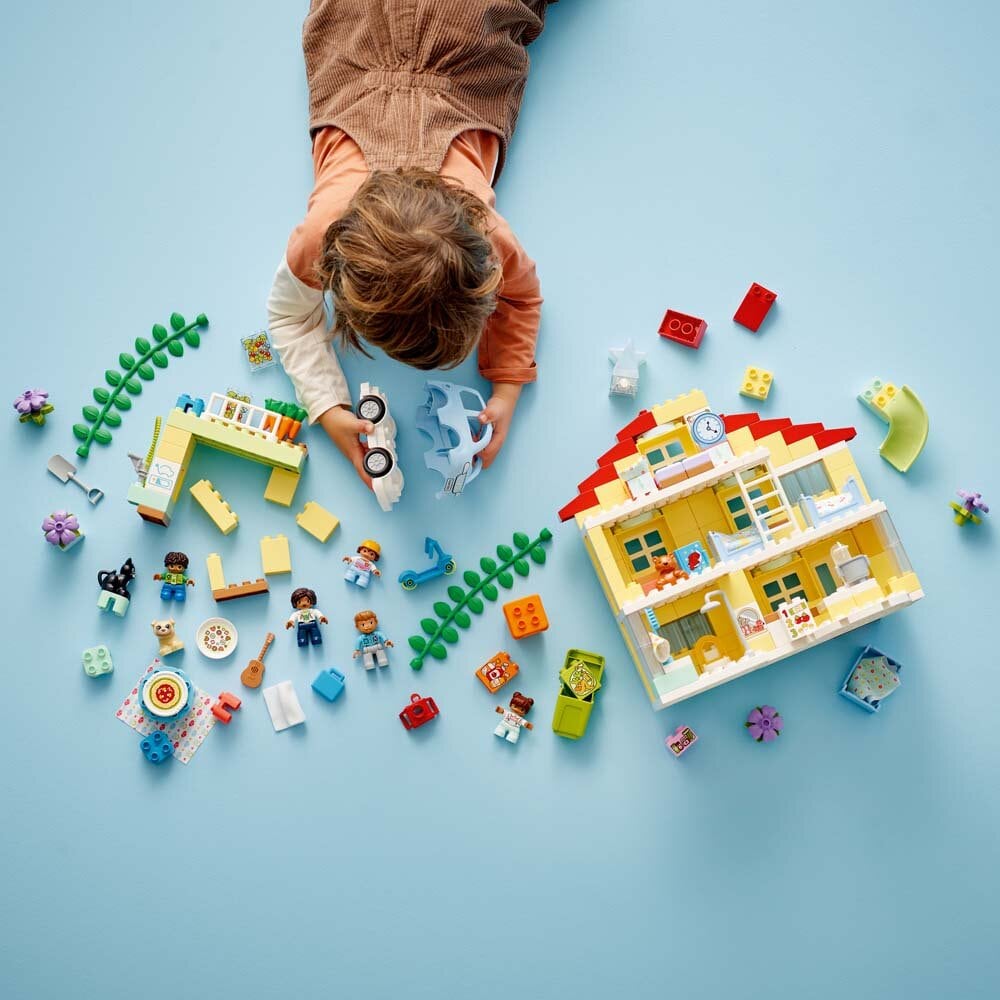 Velkommen til LEGO® DUPLO® By-sættet 3-i-1-familiehus (10994), der rummer en verden af læring for børn. Huset er fyldt med autentiske detaljer, så børn fra 2 år og deres forældre kan udspille dyrebare øjeblikke sammen. Med de medfølgende 7 figurer kan forældrene lære de små om sociale færdigheder, mens børnene styrker deres egen selvudfoldelse. Til børn, der elsker familielege Der er masser af diversitet og læring i huset. De mindste kan udspille sengetidsrutiner, bl.a. tandbørstning og godnatlæsning i køjesengen, hvor de kan skabe en hyggelig stemning med lysklodsen i stjernelampen. De lærer om sund mad i køkkenet eller ved at hente legetøjstomater og gulerødder i haven. I garagen står en elbil, der kan bygges og "oplades" af solpaneler, med en sjov skub-og-kør-funktion, der gør legen actionfyldt. Ægte kreativt byggeri Legetøjshuset kan bygges på 3 måder, så legen hele tiden føles ny. Børn kan lave et stort 3-etagers hjem, en høj bygning eller 2 mindre boliger forbundet af en have.