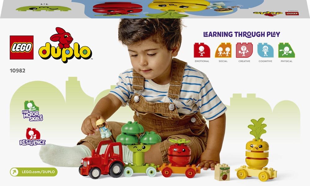 LEGO® DUPLO® Mine første-legetøjet Traktor med frugt og grøntsager (10982) rummer masser af sjov læring for de mindste. Små børn kan tage med landmanden ud for at høste frugt og grøntsager med traktoren med 3 påhængsvogne, der kan køres. Børn fra 1½ år styrker motorikken, mens de lærer om, hvordan frugt og grønt gror, og de kan stable klodserne for at få planterne til at "vokse". Der er masser af sjov med farvesortering i sættet – børn kan matche planten med traileren i samme farve eller bruge deres kreativitet og selvudfoldelse til at blande farverne eller endda bytte rundt på ansigterne! Lærerigt legetøj, der gør det sjovt at lære Alt LEGO DUPLO legetøj er designet af eksperter og omfatter sjove fortællinger, flotte farver, engagerende figurer og masser af detaljer, der udvikler lærelystne små børns færdigheder. Dette sæt er kompatibelt med de andre legetøjssæt i Mine første-sortimentet med økologisk tema, samt med alle andre LEGO DUPLO modeller.