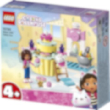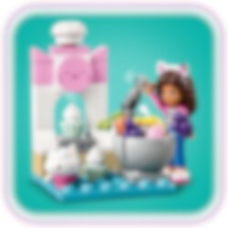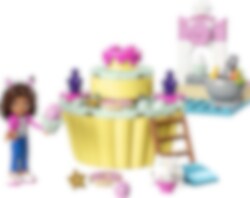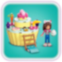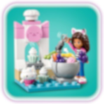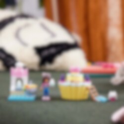 Tag med Gabby og Muffins i køkkenet for at bage en cupcake! Bland ingredienserne i skålen, og sæt den ind i den søde kokkekat-ovn. Så er der en kæmpe kage at dekorere med lækkerier. Muffins bruger en stige til at nå højt op. Når du er færdig, kan du dreje kagens top rundt og rundt for at beundre dine kreative kageevner!