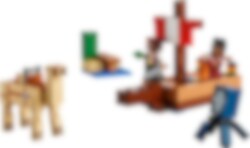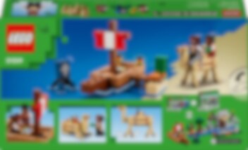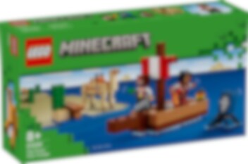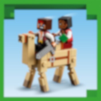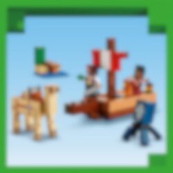 Gå ombord på skibet med 2 LEGO® Minecraft® pirater, og sæt sejl mod eventyr i ørkenbiomet. Hvad er det, der lurer i vandet? Det er en blæksprutte! Sæt kursen mod land, hvor du kan tjekke kortet, sadle kamelen op og ride en tur til dit næste episkeMinecraft-eventyr.
