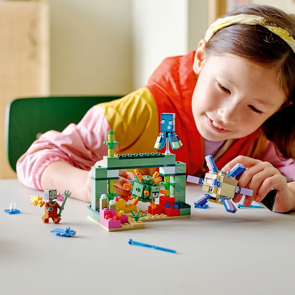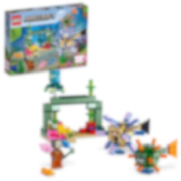 LEGO® Minecraft® Vogterkampen (21180) tager spillere fra 8 år med på et undervandseventyr fyldt med velkendte karakterer samt funktioner og detaljer fra det ultrapopulære spil. Oceaner af sjov for Minecraft-spillere Børn kan påtage sig en actionfyldt udfordring i denne medrivende Minecraft-mission, der foregår under havet. Først skal de bygge et monument midt i det farverige koralrev. Der er skjulte skatte at finde, men også 2 ikoniske Minecraft-mobs: en vogter og en ældstevogter, der er fast besluttede på at stoppe dem. Bevæbnet med en trefork og med hjælp fra 3 tamme axolotler skal børn kæmpe mod de fjendtlige mobs for at fortsætte deres mission. Der er yderligere fare fra en fjederbetjent skyder, som affyrer et lasermissil med et svirp fra ældstevogterens hale. Dette LEGO klodseventyr rummer uendelige kreative legemuligheder og giver dermed børn spændingen ved Minecraft-spillet mellem hænderne.