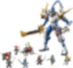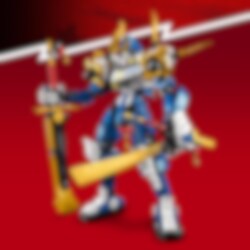 Gør dig klar til en episk kamp, når Jay i sin mest kraftfulde mech-robot nogensinde sammen med ninjakrigeren Nya tager kampen op mod 3 farlige grønne knoglekrigere. Pas på! Knoglekongen, Knogleridder og Knoglejæger er klar til at skyde dem begge ned med en hurtigtskydende dobbelt armbrøst ladet med 4 pile og monteret på en vogn. Kæmp tilbage med kamprobottens store drageklinge, 2 katanaer og 2 skydere. Du må og skal redde NINJAGO® City fra deres angreb!