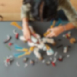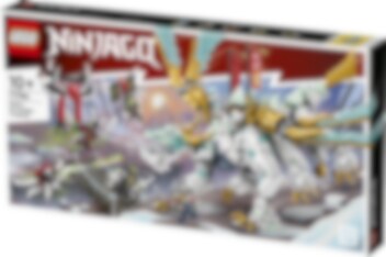 Flyv ned fra skyerne med Zane og hans fantastiske isdrage for at kæmpe mod 3 onde grønne knoglekrigere. Angrib med dragens skarpe iskløer, horn, hale og isånde! Når du har vundet kampen, kan du ombygge modellen til en imponerende dragekriger på 2 ben med en stor gylden klinge. Du kan vælge mellem 2 fantastiske kampklare væsner for at beskytte NINJAGO® City mod angreb!