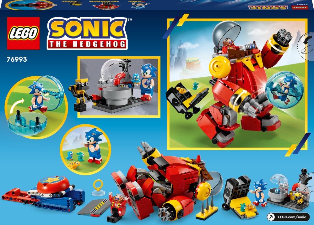 Børn kan slå sig sammen med Sonic og blive dagens helt med LEGO® Sonic the Hedgehog legesættet Sonic mod dr. Eggmans dødsæg-robot (76993) til børn fra 8 år. Sonics ærkefjende dr. Eggman og hans håndlanger, Cubot, har fanget dyr for at få energi til deres opfindelser. Børn kan sende Sonics fartkugle afsted for at besejre dr. Eggman og derefter undersøge forskningsstationen for at samle data til deres næste opgør. Hurtig actionleg Børn kan bruge fartkuglen og affyreren til at klare rampen og piggene. Dødsæg-robotten har en aftagelig kapsel, der indeholder de dyr, dr. Eggman bruger til at drive den. Dyrene kan skubbes ud og reddes, når Sonic scorer en direkte træffer på dr. Eggman med fartkuglen. Mange måder at lege på Hurtigt actionsjov møder kreativ leg med LEGO Sonic the Hedgehog™ legesæt. Fans af "det blå lyn" vil elske at skabe scener inspireret af populære Sonic-eventyr. Når det er tid til at sætte farten ned, kan børn nyde fantasifulde lege med at tage sig af Sonics dyrevenner.