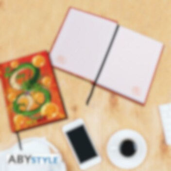 Fed notesbog i orange med motiv af dragen Shenron og Dragon Balls på forsiden og Dragon Balls japanske logo på bagsiden. En sjov ting at tage med i skole, da det er en anderledes notesbog eller hvorfor ikke skrive dine strategier ned, for at finde stederne og samle alle syv Dragon Balls?
