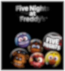 6 st. farlige knapper med Five Night of Freddy's motiver. 4 af knapperne er ca. 2,5 cm i diameter og de sidste to er lidt større, med 3,2 cm i diameter. Knapperne er fastgøres med en sikkerhedsnål bag på.