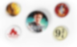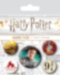 5 stk. badges med sejt motiv fra Harry Potter. 4 badges måler ca. 2,5 cm i diameter og 1 badge er ca. 3,8 cm i diameter.