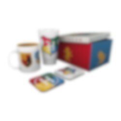 Über sejt gavesæt, med motiver af de fire sovesale fra Harry Potter-serien. En sjov gave til alle, der elsker Harry Potter. Pakken indeholder et porcelænskrus, et drikkeglas og 2 stk. coasters, leveret i en unik gaveæske. Dette er et officielt licenseret Harry Potter-produkt.