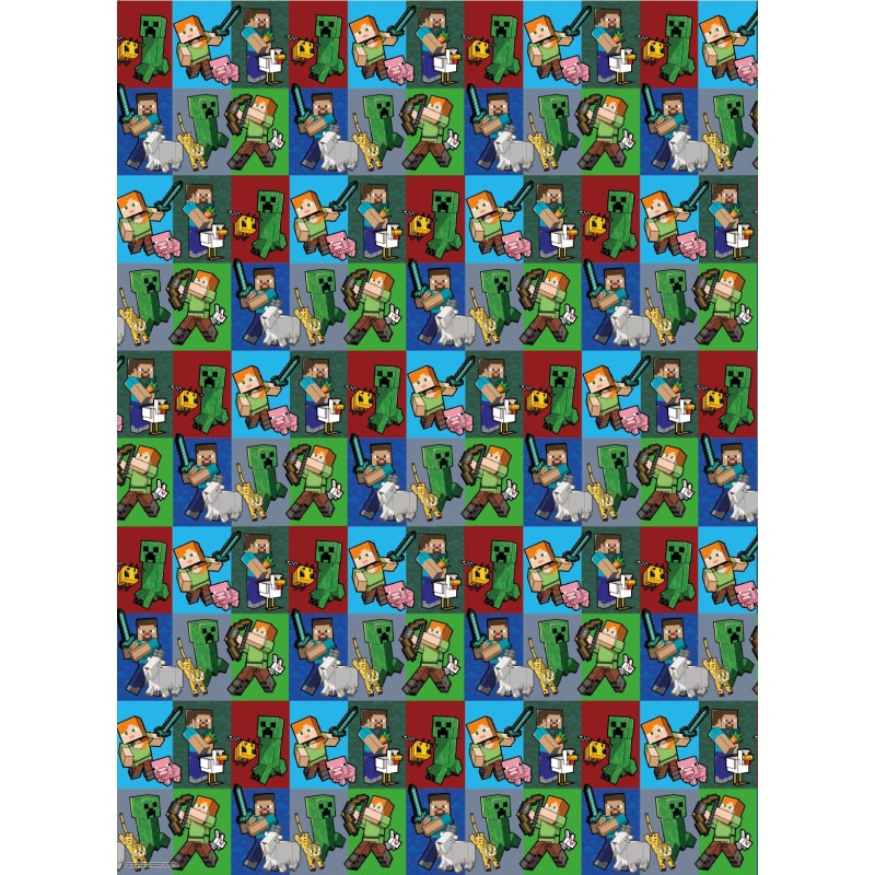 Gavepapir med forskellige motiver fra spillet Minecraft. Pakken inkluderer 2 stk. gavepapirark, der er 50 x 70 cm store, og 2 stk. etiketter.