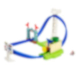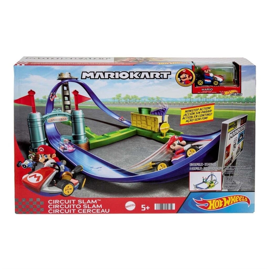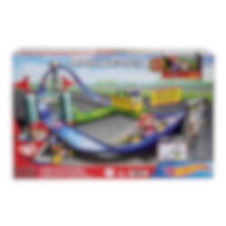 Hurtig racerbane fra Hot Wheels med Super Mario tema. Racerbanen er oval med skråninger og der medfølger bil til banen. Og det er Mario selv, der kører bilen! Racerbanen har en sjov funktion til at skubbe bilen væk og i kurven vil Mario gå op og ned! Udfordringen bliver at skyde bilen væk med den helt rigtige fart for at holde den på banen.