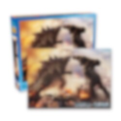 Sejt puslespil med motiv af Godzilla og King Kong. Puslespillet har 1000 brikker og størrelsen på puslespillet når det er færdigt er 51 x 71 cm.