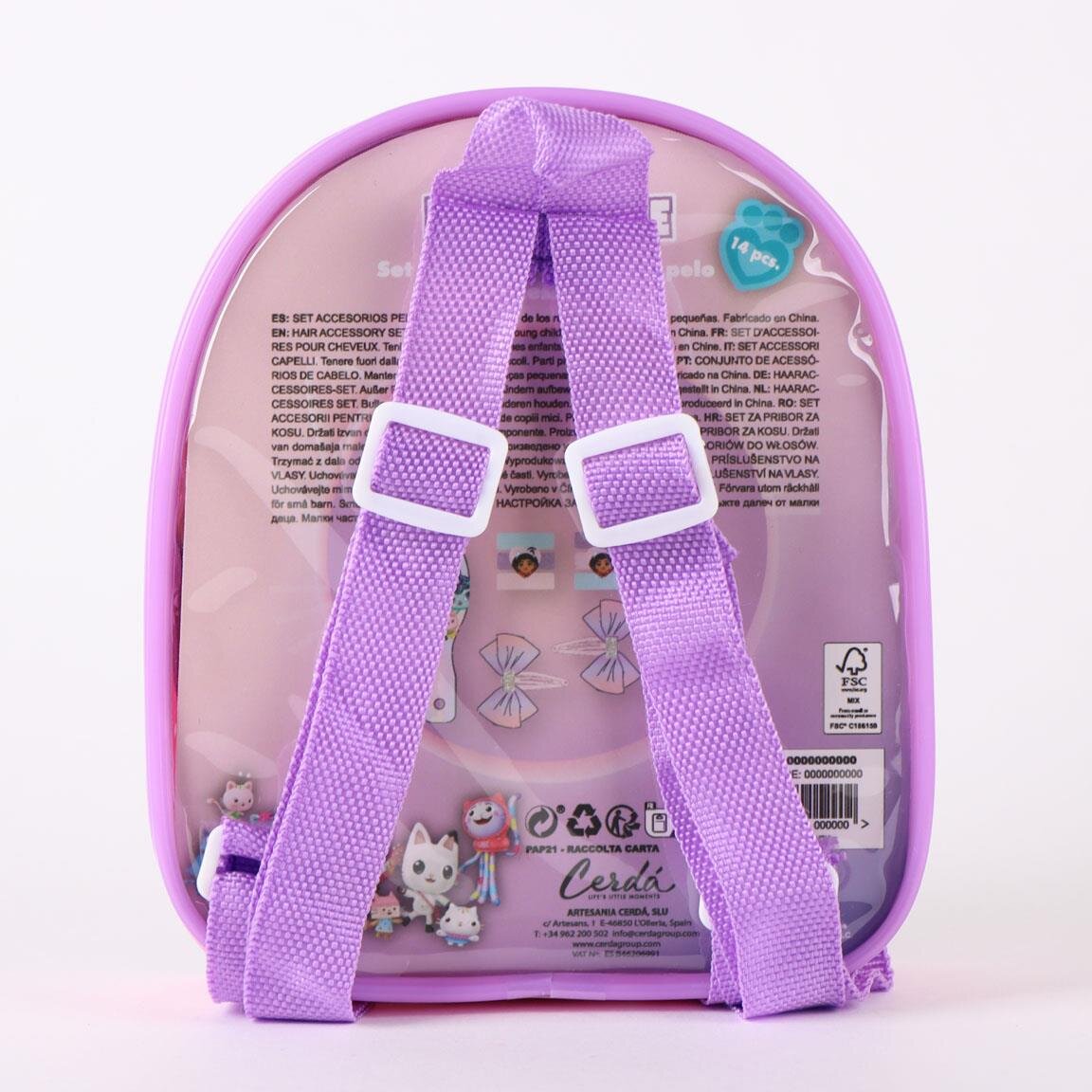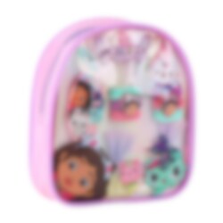 En farverig og legende rygsæk fyldt med sjove håraccessoires i Gabby's Dollhouse-tema, til børn der elsker at lave sjov, sætte hår og tage deres yndlingsting med overalt.