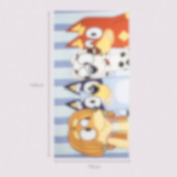 Lad Bluey og hendes glade venner være med på næste badeeventyr! Dette farverige badehåndklæde er med motiv af Bluey, Bingo og deres venner mod en blå- og hvidstribet baggrund. Det bliver hurtigt en favorit for børn, der vil tørre sig med stil efter et bad i poolen eller havet.