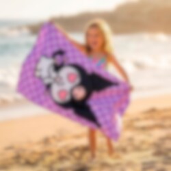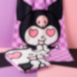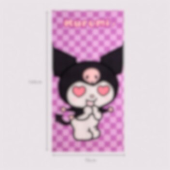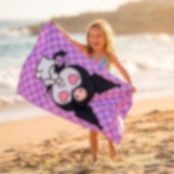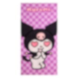 Nyd blødheden med Kuromi efter et dejligt bad! Dette badehåndklæde har motiv af den populære Sanrio-karakter med hendes ikoniske hjerteøjne mod en lilla ternet baggrund. Designet fanger hendes personlighed og er en sjov detalje ved poolen eller i badeværelset.