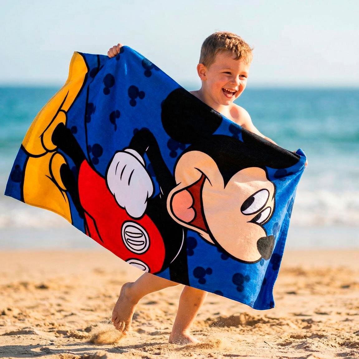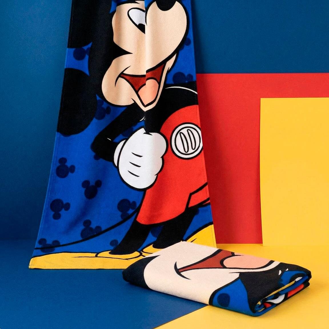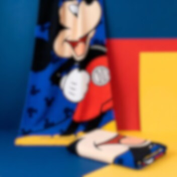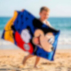 Gør badestunden endnu sjovere med et badehåndklæde prydet af alles favorit, Mickey Mouse. Med sit brede smil og de klassiske røde bukser spreder han øjeblikkelig glæde på stranden eller ved poolen. Den blå baggrund med små silhuetter giver håndklædet et ekstra legende udtryk, som børnene vil elske.