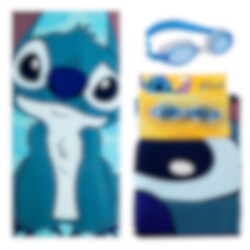 Sæt med badehåndklæde og svømmebriller i Stitch-tema, ideelt til strand, pool og alle sommerens badeeventyr. Det farverige design med Stitch gør sættet både legende og praktisk, og passer godt til børn, der kan lide at lege i vandet.