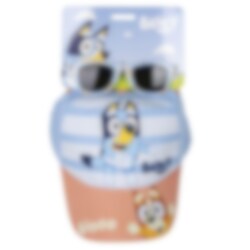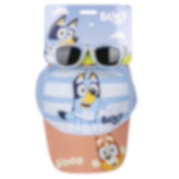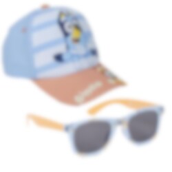 Et komplet sæt med både en smuk blå kasket og et par premium solbriller, begge i børnestørrelse. På brillerne er der motiver fra Bluey.