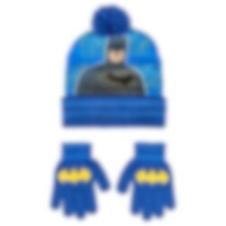 Beskyt mod kulden med dette seje Batman-sæt! Huen har en kvast på toppen og er dekoreret med en sejt Batman-design, mens de blå handsker har hans ikoniske flagermuslogo. Perfekt til små superhelte.