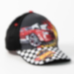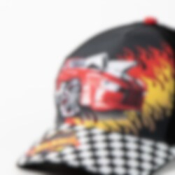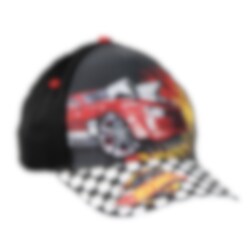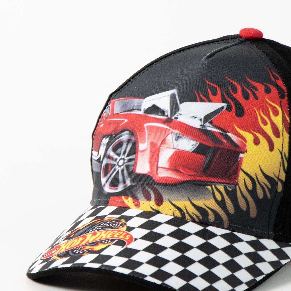 En fed børnekasket med Hot Wheels-tema og et flot motiv af en hurtig sportsvogn og flammende detaljer, der skaber en følelse af fart og leg for børn, der elsker biler og eventyr.