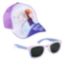 Et komplet sæt med både en smuk kasket med Anna og Elsa på og et par premium solbriller, begge i barnestørrelse. På de lyserøde og blå tonede glas er der motiver af de to søstre fra Disneys storfilm Frost og teksten "Forever sisters".